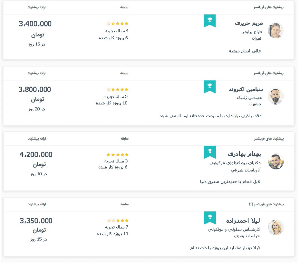 بعد از ثبت پروژه فریلنسرها برای شما پیشنهاد قیمت و مدت زمان انجام کار ارسال می کنند